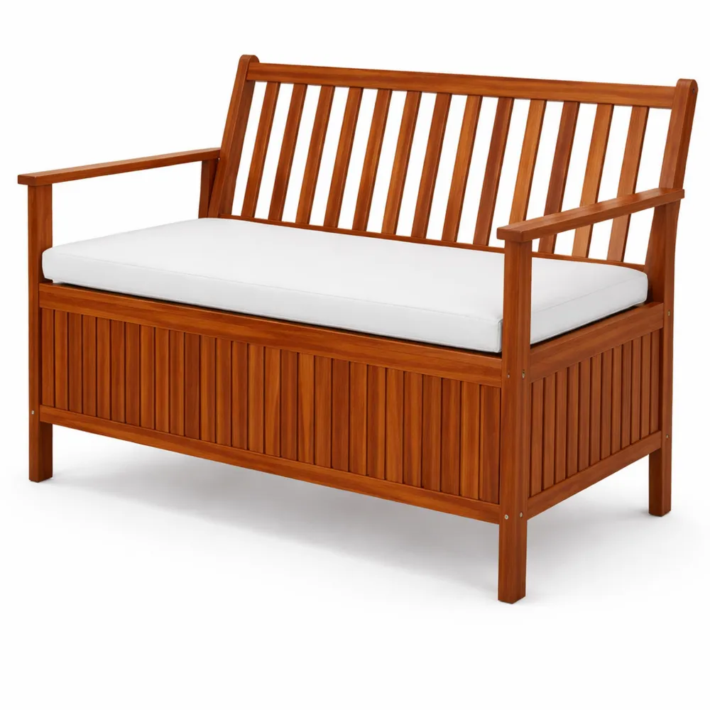 Ce banc de jardin en bois d'acacia est doté d'un compartiment de rangement. Adapté à un usage en extérieur comme en intérieur, il offre la possibilité de ranger divers articles sous l'assise. L'acacia est connu pour sa longévité et sa résistance aux intempéries, ce qui en fait un choix durable pour le jardin. Le coussin en polyester est amovible grâce à une fermeture éclair, facilitant ainsi son entretien. Dimensions : environ 120 x 62 x 82 cm. Hauteur d'assise : environ 44 cm. Capacité de charge : 320 kg.